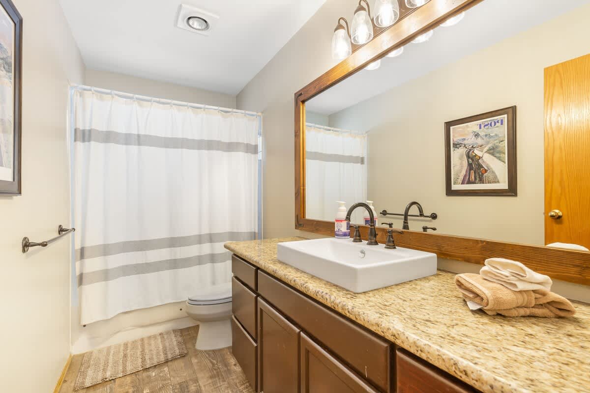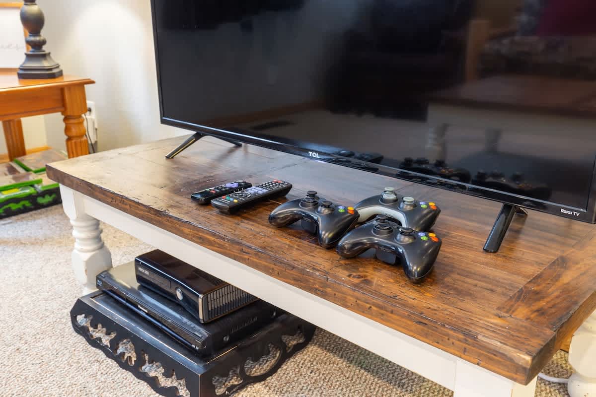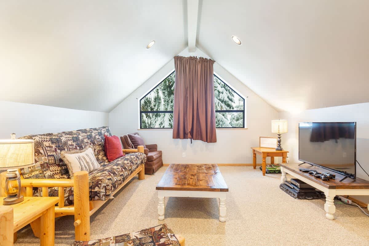 The second floor features an additional living room with futon bed, tons of movies, a game console with tons of games, and the second full bathroom.