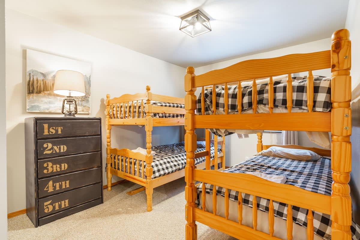 When entering the cabin, you will find a large living room, fully equipped kitchen, a full bathroom, and 2 bedrooms; 1 with a queen sized bed and the second with two sets of twin bunk beds.